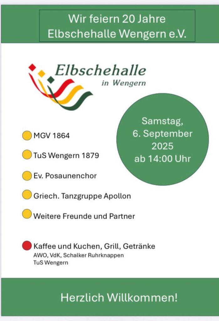 Am 06. September 2025 feiert der Elbschehalle Wengern e.V. sein 20jähriges Beestehen und wir sind mit einem Auftritt auf dem Elbschehallenfest dabei.