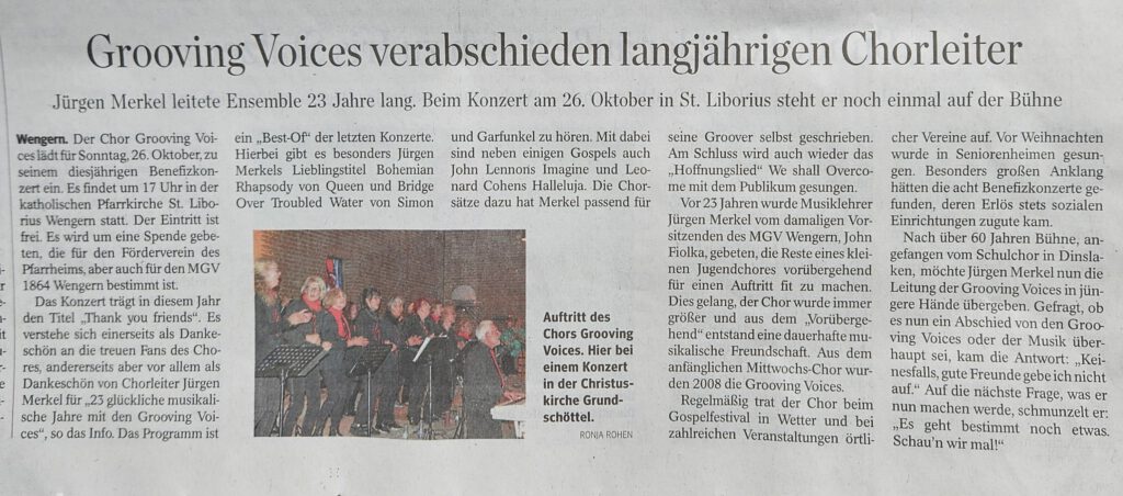Wir proben immer mittwochs, 19:00 Uhr im Gemeindehaus St. Liborius, Am Leiloh in 58300 Wetter – neue Sänger und Sängerinnen sind willkommen, vorzusingen braucht ihr nicht. Natürlich kann auch mal die eine oder andere Probe ausfallen wegen Urlaub oder der Raum sich ändern, daher kannst du zur Sicherheit vorab mit unserem Chorleiter Jürgen Kontakt aufnehmen über grooving-voices@web.de.